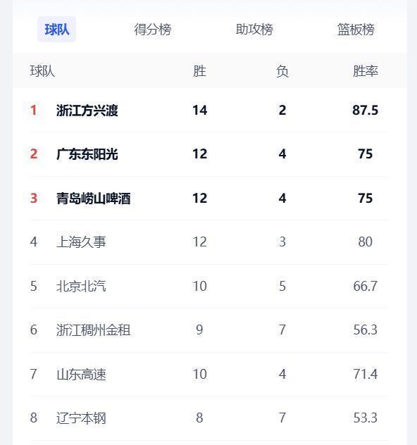 CBA最新排名:广厦队稳居第1,广东二连败排名第2,辽宁重回前8