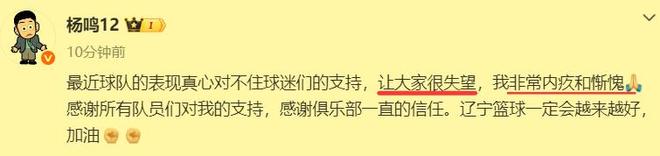在辽篮宣布杨鸣因身体原因离队休息后不久,杨鸣也通过个人社交媒体对自己的辞职进行了回应。他并没有找借口,而是一如既往地那么有担当,开口就向球迷道歉,表示内疚和惭愧。