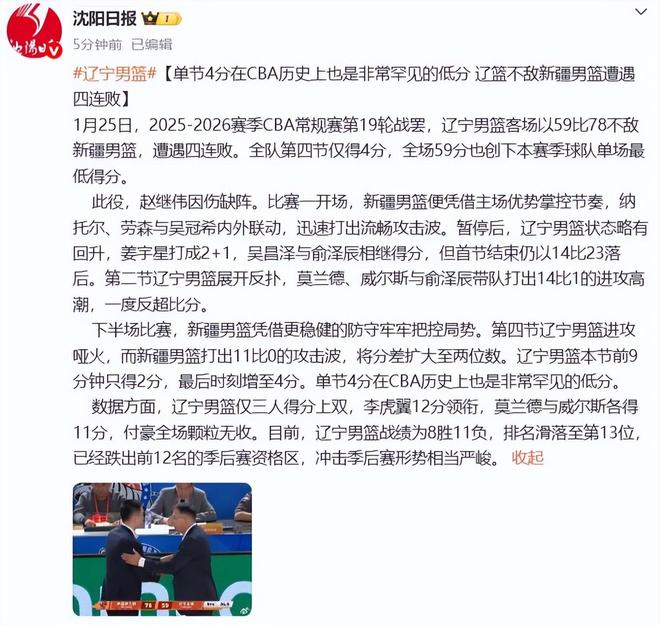 近7场6败,辽篮难求一胜,沈阳日报发文,四个字直戳4冠王心窝