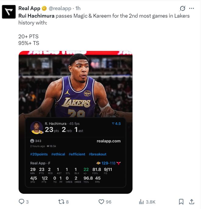 这场比赛后八村垒超越魔术师、贾巴尔成为湖人队史拿下20+真实命中率95%以上第二多的球员,队史第一是拜伦-斯科特4次。