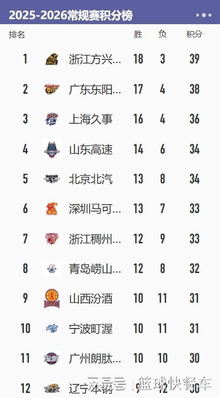 CBA积分榜最新排名出炉!广厦第1辽篮第12:山西已跌出前八?
