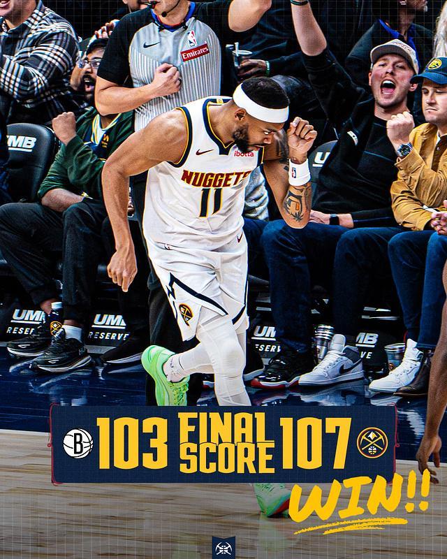 进入第四节比赛,掘金前3分多钟维持87-79领先优势,篮网一波13-3攻势反超2分。双方之后缠斗至掘金95-94领先,穆雷连续关键得分保持微弱领先优势,瓦兰丘纳斯关键两罚全中,最终掘金107-103险胜篮网。