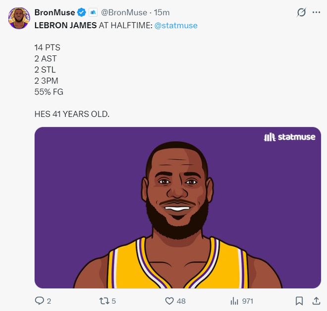 而且勒布朗上半场打了17分钟,他以55%的命中率拿到14分1篮板2助攻2抢断2个三分球,勒布朗打无球的效率也很高,41岁的老头子再一次打脸外界的质疑。