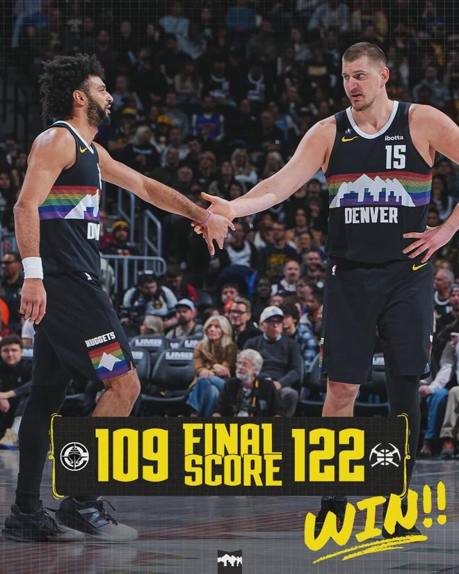 掘金3分钟还了一波13-4,再次领先到两位数。约老师背后击地秒传沃特森,后者双手暴扣。当约老师被换下场,全场球迷起立鼓掌。最终掘金122-109战胜快船,约基奇投篮11中8,三分3中2,罚球17中13,狂砍31分12板5助3断。