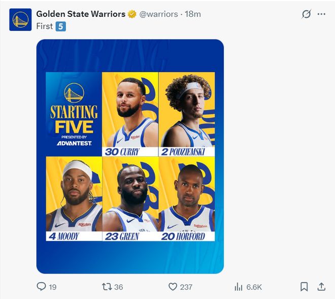 勇士:库里、波杰姆斯基、穆迪、追梦、霍福德;