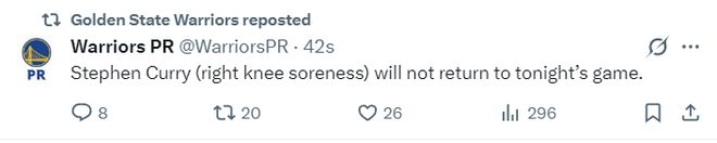 勇士官方:斯蒂芬-库里的右膝仍有疼痛症状,他将缺席本场比赛的末节。