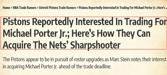 据NBA记者Marc Stein报道,活塞希望在截止日前引入这位27岁的小前锋,球队内部评估认为,他的得分能力、比赛经验和精湛的射术,能帮助球队在季后赛走得更远。