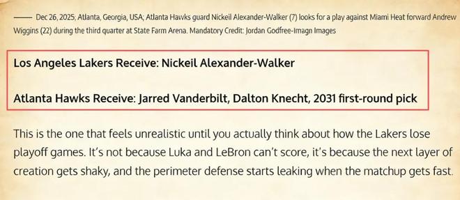 据美媒《Fadeaway World》最新的报道,老鹰后卫亚历山大·沃克成为湖人引援雷达上的最新目标,并且他们还列出了一套潜在的交易方案——