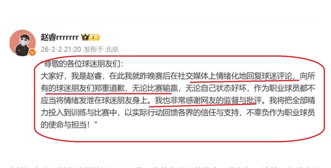 2月2日,晚上9点!北京队球员赵睿,通过网络平台发文,正式向球迷进行道歉!