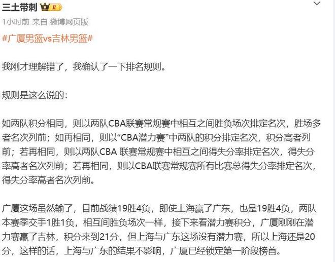 输掉这一场后,山东提前无缘前四排位,本轮如果上海击败广东(大概率事件),那么上海在第一阶段的积分将和广厦齐平都来到42分,但广厦却依旧还是第一阶段的榜首,据媒体人“三土带刺”给出的消息,广厦和上海赛季交手1胜1负,广厦刚刚在潜力赛赢了吉林,积分来到21分,本轮上海和广东没有潜力赛可打,广厦将凭借潜力赛积分优势力压上海,锁定第一阶段榜首。