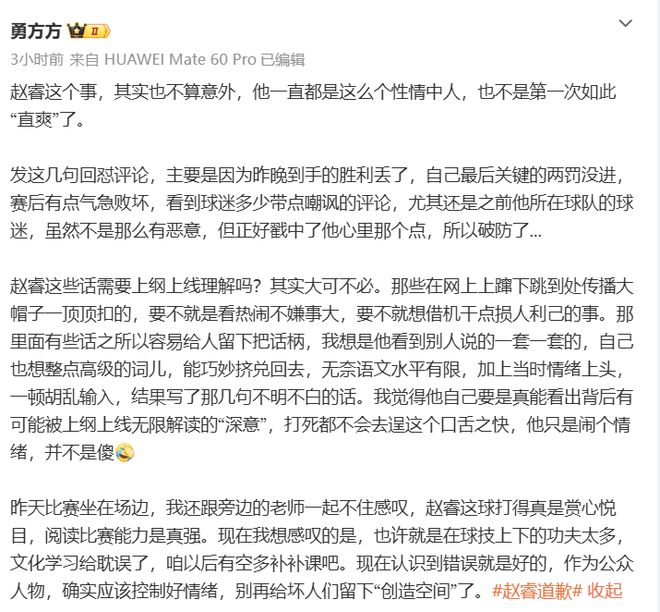 公开道歉一出,不少北京的媒体人也纷纷为赵睿说好话,洗脱罪名,勇方方表示:赵睿是性情中人,语文水平有限,输球闹情绪逞口舌之快,结果写几句不明不白的话,网友也大可不必上纲上线,扣帽子。