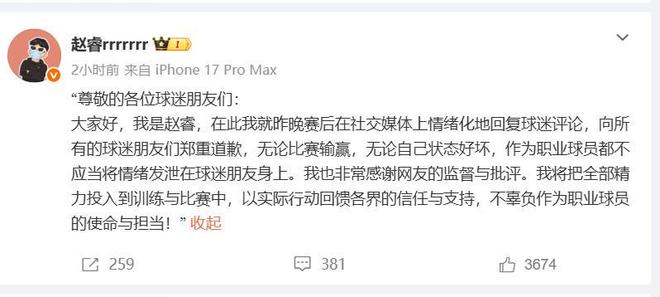 赵睿这波争议言论影响非常恶劣,伤害了新疆球迷,2月2日晚,意识到事件严重性的赵睿,在个人社媒上发表了公开致歉,表示:“向所有的球迷朋友们郑重道歉,无论比赛输赢,无论自己状态好坏,作为职业球员都不应当将情绪发泄在球迷朋友身上”。