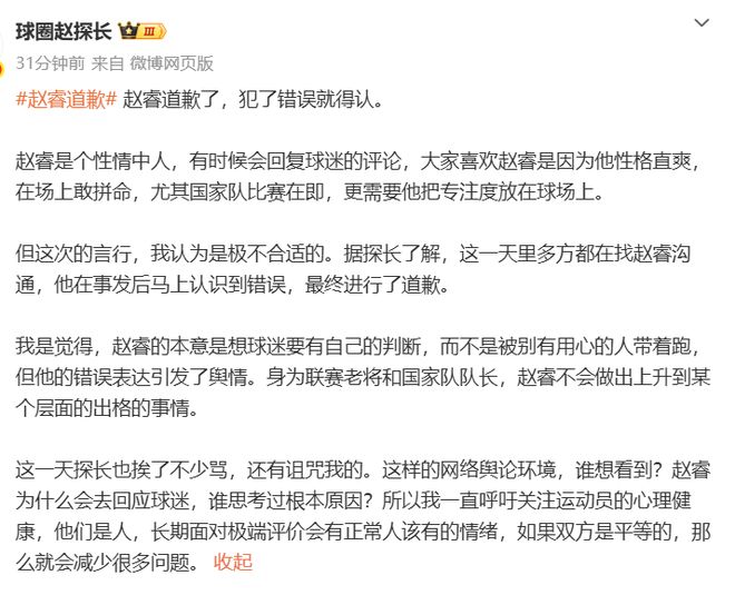 赵探长认为:赵睿犯了错就得认,这一天多方都在找赵睿沟通,他已经意识到了错误,赵睿的本意是想球迷要有自己的判断,而不是被别有用心的人带着跑,但他的错误表达引发了舆情。