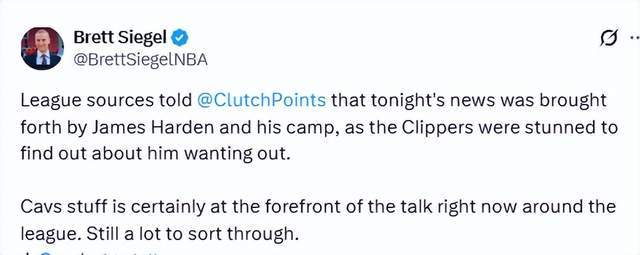 北京时间2月3日,据名记Siegel报道,哈登寻求离开快船的消息,是由哈登及其团队主动放出的,快船得知哈登的离队想法后,感到十分震惊。目前,全联盟的交易讨论焦点无疑都集中在骑士队的潜在报价上。不过,这笔交易仍有诸多细节有待敲定。