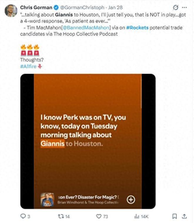 "如果字母哥真来火箭,建议直接交易哈登换回几个首轮!"