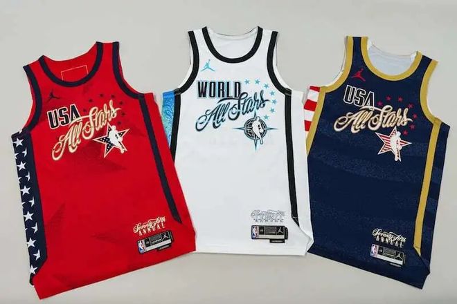 三款球衣各具特色:美国队两款分别为印着星星图案的红色球衣、印着条纹图案的蓝色球衣,世界队则是一件点缀地球图案的白色球衣。这三款设计独特的球衣均由乔丹品牌打造,球衣背面号码上方还会印有球员的本国国旗。