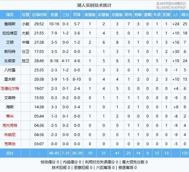 湖人:詹姆斯25分3板7助3断、东契奇24分6板5助、拉拉维亚18分5板、里夫斯15分4板1助2断、海斯9分1板2助、艾顿7分8板3助、范德比尔特6分5板3助、斯玛特6分3板1助