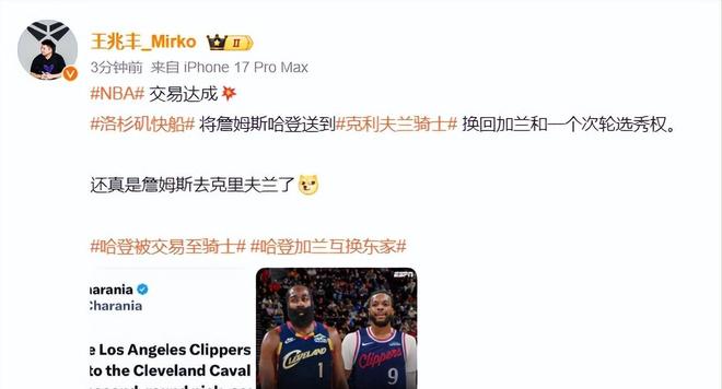 北京时间2月4日,NBA交易市场在截止日前迎来关键动作,据知名记者沙姆斯·查拉尼亚报道,洛杉矶快船与克利夫兰骑士已达成交易,詹姆斯·哈登与达里厄斯·加兰互换东家。