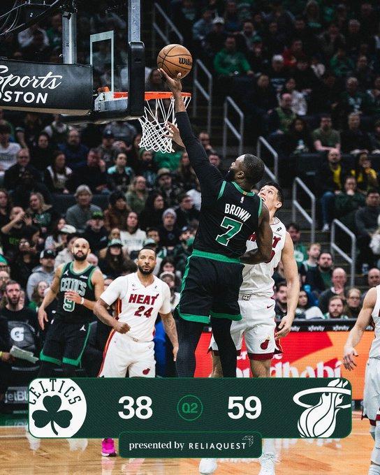凯尔特人过去4场连赢国王、雄鹿、独行侠与火箭收获4连胜,热火上一场主场115-127输给老鹰,本赛季前两次交锋凯尔特人均战胜热火。本场凯尔特人缺少塔图姆,热火缺少希罗与罗齐尔。首节开局热火9-0领先,并在之后扩大15-2领先,热火持续三分命中继续拉开25-6领先。凯尔特人一波9-4攻势追分,首节比赛结束热火29-15领先凯尔特人。首节热火24中12,其中三分12中5,阿德巴约7中4得到10分与鲍威尔8+2+2;凯尔特人被限制24中6低迷,其中三分10中1,布朗5中0与怀特6中1均是只得到2分。