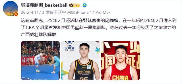 就像“导演我躺哪”说得那样:“这有点励志,25年2月还活跃在野球赛事的庞峥麟,在一年后的26年2月进入到了CBA全明星首发和中国男篮新一届集训队,他在过去一年还经历了之前效力的广西威壮球队解散。”
