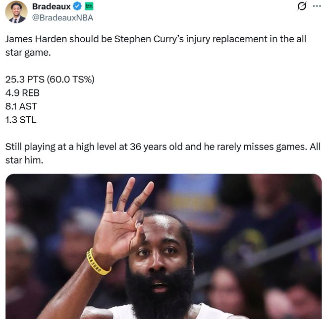 在库里确认伤缺之后,哈登是社媒球迷热议的递补人选之一,他与湖人里夫斯的呼声甚至要超过英格拉姆。