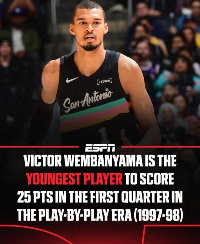 五,文班亚马22岁38天单节25分,创造Play-by-play时代最年轻球员纪录。