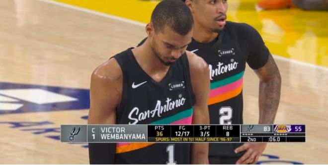 文班亚马的出色表现提前奠定比赛基调,他在第二节出场10分20秒,单节8中4,外加罚球4中4,单节得到12分。文班亚马上半场仅出场18分19秒,已经高效17中12,其中三分5中3与罚球12中10,一人狂轰37分8篮板,率领马刺上半场已经取得84-55领先29分优势。
