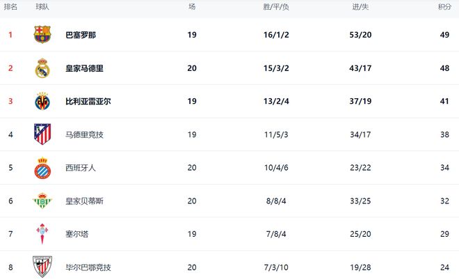在积分榜上,巴萨16胜1平2负,拿到49分排名榜首。皇马赢球后紧追巴萨。皇马的积分是48分,只落后巴萨1分。不过,巴萨比皇马少赛一场。比利亚雷亚尔总积分是41分,排名第3。第4的是马竞,只拿到38分。西班牙人这匹黑马的总积分达到34分,排名第5。皇家贝蒂斯以32分排名第6。塞尔塔29分,排名第7。