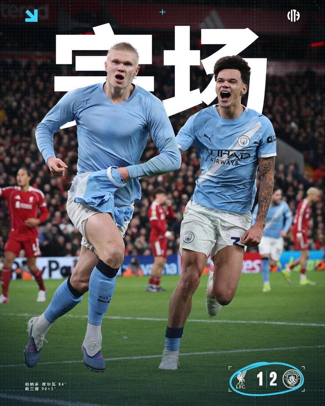 此役曼城球员哈兰德错失单刀,利物浦球员索博斯洛伊无解世界波破门,曼城球员B席扳平比分,哈兰德点射绝杀,曼城2-1完成大逆转,赛季双杀利物浦,仍落后领头羊阿森纳6分。