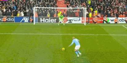 第92分钟,阿利松禁区内扑倒努内斯,裁判判罚点球,随后哈兰德操刀命中,完成传射建功好戏,曼城反超比分,2-1!
