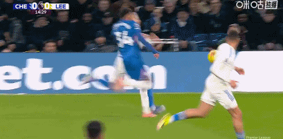 第13分钟,格鲁耶夫放倒帕尔默,裁判示意犯规