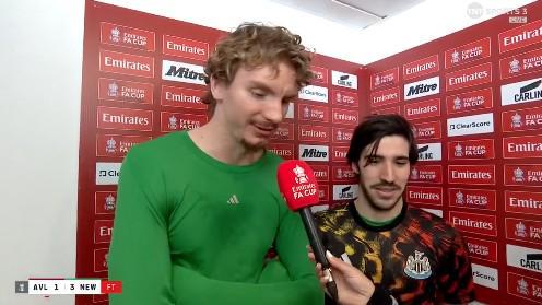 英格兰足总杯第4轮,纽卡客场3-1战胜维拉,进球的沃尔特马德和托纳利赛后接受了TNT体育的采访。