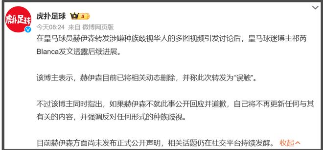 舆论升级过程中,有一位网红博主尝试联系皇马俱乐部和赫伊森本人,都没有得到正式回应,绕了一圈联系了赫伊森的队友,也就是皇马俱乐部其他球员,才被告知是赫伊森不小心碰到了才转发的,包括删除动态,都是赫伊森队友和赫伊森妈妈提醒的——他妈妈来了!他妈妈真的来了!